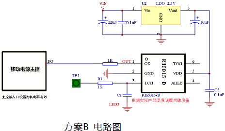 方案B:在觸摸芯片前單獨(dú)加LDO穩(wěn)壓,主控輸入口識(shí)別低電平有效時(shí),選用RH6015-D。